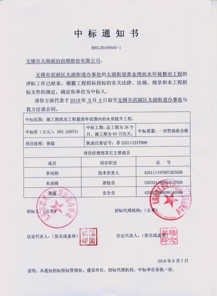 8月7日,MK在线在太湖街道黄金湾浜水环境整治工程投标阶段,凭借良好的市场信誉,成熟完善的投标方案,从众多竞争对手中脱颖而出,成功中标该项目,中标价585万元。